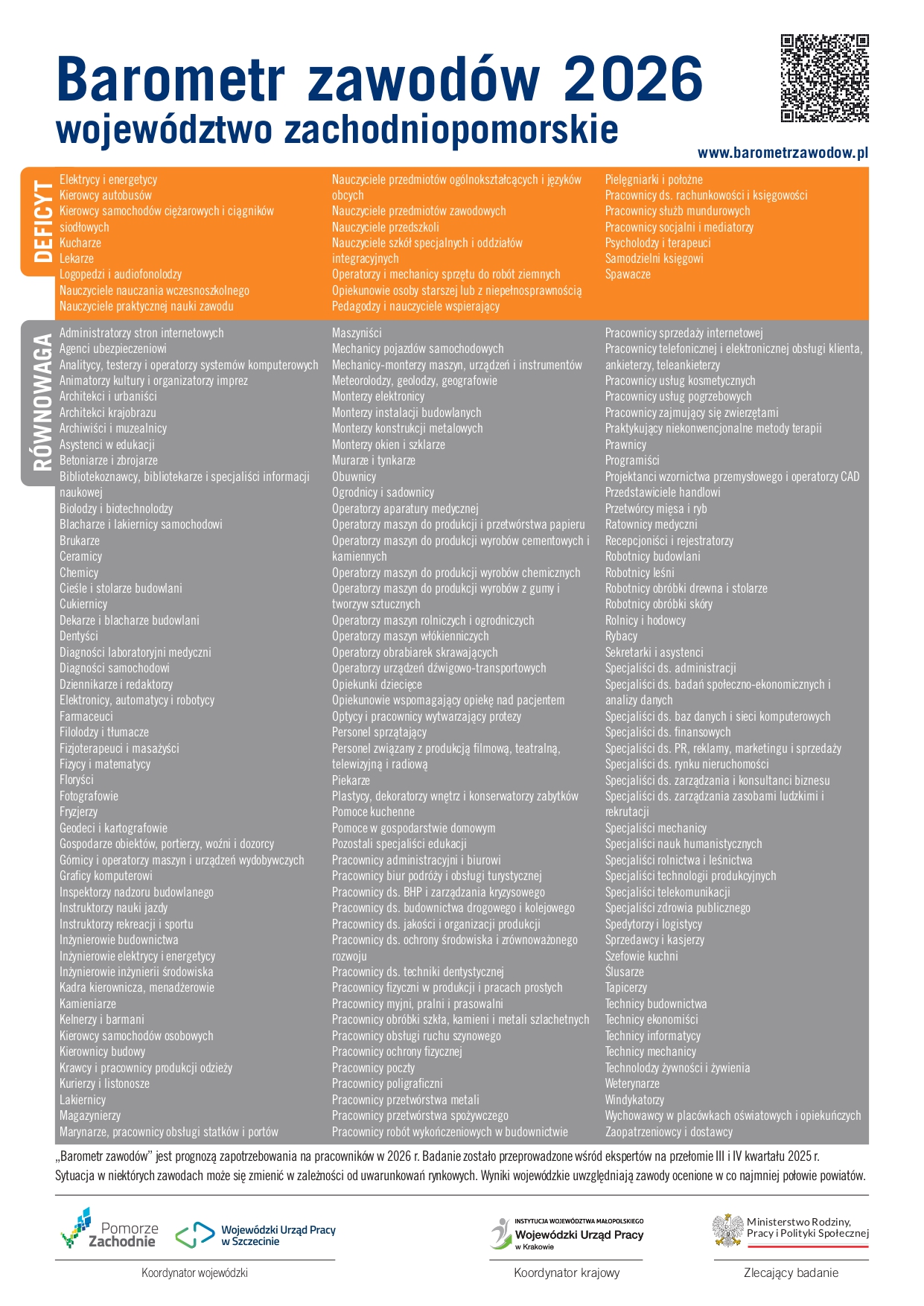 zapraszamy do zapoznania się z najnowszymi informacjami dotyczącymi prognozowanego zapotrzebowania na zawody w 2026 roku w województwie zachodniopomorskim (na podstawie badania "Barometr zawodów 2026").